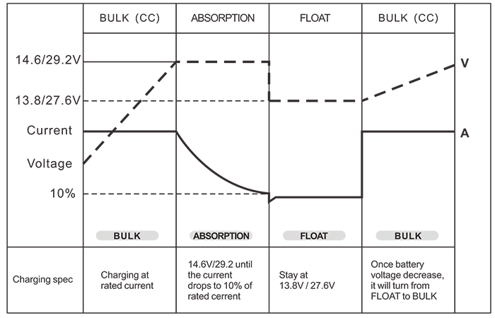 Батареяны басқару (3 сатылы батарея зарядтағыштары) Жаппай / сіңіру / қалқымалы
